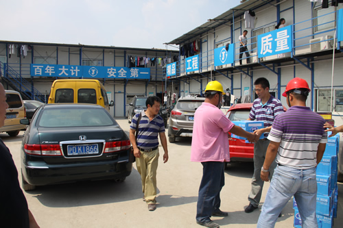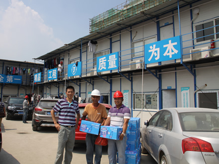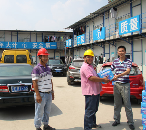 驕陽(yáng)似火,熱浪滾滾,持續(xù)近一個(gè)月的高溫天氣給工程正常施工帶來(lái)了很大的影響,奮戰(zhàn)在烈日炎炎下的一線員工的身體狀況時(shí)刻牽動(dòng)著公司領(lǐng)導(dǎo)的心。7月29日,上海室外溫度更是超過(guò)40度,江蘇華建副總經(jīng)理、上海分公司總經(jīng)理?xiàng)罱芴氐匚锌偣こ處熚捍好鳌⒐?huì)副主席陳德權(quán)等同志赴由公司承建的上海楓葉國(guó)際學(xué)校工地看望一線作業(yè)人員,為員工送去了礦泉水、毛巾等清涼慰問(wèn)品,并叮囑要注意避開(kāi)高溫作業(yè)時(shí)段,保護(hù)身體,確保夏季施工生產(chǎn)安全。
