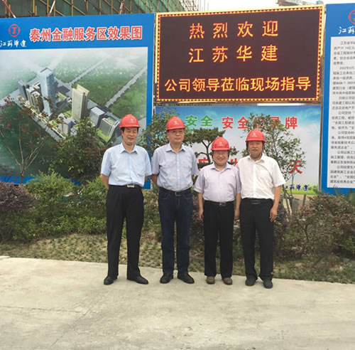 15日,宗總等領(lǐng)導(dǎo)一行親臨工地,視察由蘇北分公司承建的泰州金融服務(wù)區(qū)項目。