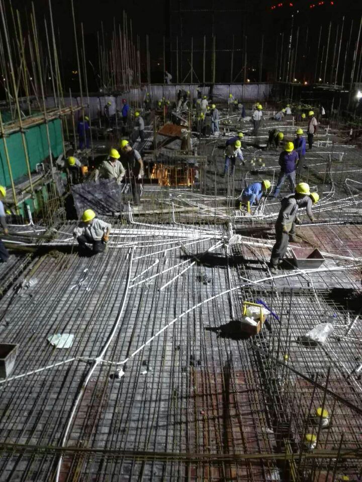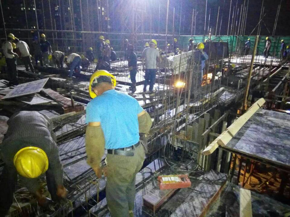 客戶的要求就是使命。江蘇華建上海公司本著“客戶至上”的原則,立即成立臨時(shí)指揮部,上海公司蘇南分公司、第八工程處全員出動(dòng),在短短的一個(gè)小時(shí)內(nèi)完成了施工方案制訂、班組人員協(xié)調(diào)和設(shè)備材料到位等全部準(zhǔn)備工作。配置鋼筋工46人、木工78人、瓦工18人、水電工23人。30日上午9點(diǎn),開始墻柱鋼筋綁扎作業(yè),并在3個(gè)小時(shí)內(nèi)完成任務(wù),期間同時(shí)穿插木工搭設(shè)排架、安裝墻板等施工作業(yè)。下午2點(diǎn),模板頂板鋪設(shè)基本完成,水電工2小時(shí)內(nèi)完成水電預(yù)埋。下午6點(diǎn),木工用時(shí)2小時(shí)完成吊模作業(yè);實(shí)測(cè)實(shí)量組和項(xiàng)目部所有質(zhì)檢員全程跟蹤檢查驗(yàn)收,嚴(yán)把工程質(zhì)量關(guān)。夜間10點(diǎn),完成問題整改使之具備砼澆筑條件。31日凌晨4點(diǎn),七層主體工程砼澆筑工作全部完成,也由此創(chuàng)造出江蘇華建上海公司“24小時(shí)澆筑一層樓”的施工新速度。