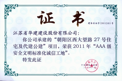 該工程先后榮獲2010年度“北京市文明安全樣板工地”和2011年度全國(guó)“AAA級(jí)安全文明標(biāo)準(zhǔn)化誠(chéng)信工地”榮譽(yù)稱號(hào)。