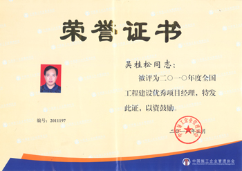 富有成效的工作,一絲不茍的精神,贏得了多方的肯定和褒獎(jiǎng)。2010年被評(píng)為廣東省優(yōu)秀項(xiàng)目經(jīng)理,2011年被評(píng)為全國(guó)項(xiàng)目經(jīng)理。