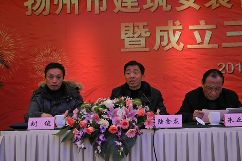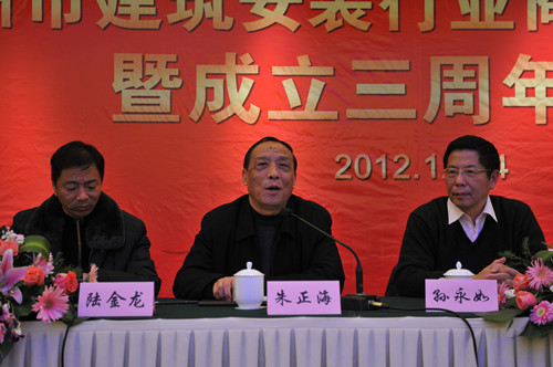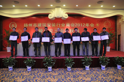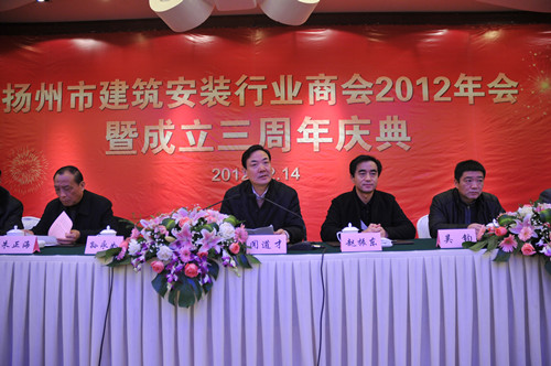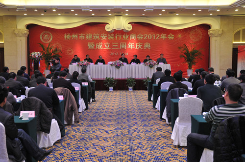 12月14日下午,揚(yáng)州市建筑安裝行業(yè)商會(huì)在揚(yáng)州西園飯店舉辦2012年會(huì)暨成立三周年慶典大會(huì),市人大副主任、市工商聯(lián)主席、市總商會(huì)會(huì)長(zhǎng)孫永如,市政府副市長(zhǎng)聞道才,市政協(xié)原副主席、市建安商會(huì)名譽(yù)會(huì)長(zhǎng)朱正海,市工商聯(lián)黨組書記、副主席、市總商會(huì)副會(huì)長(zhǎng)趙振東,市工商聯(lián)副主席吳鈞等領(lǐng)導(dǎo)出席,市城建局、民政局、工商聯(lián)相關(guān)部門負(fù)責(zé)人,相關(guān)兄弟商會(huì)、協(xié)會(huì)負(fù)責(zé)人以及建安商會(huì)所有會(huì)員單位負(fù)責(zé)人等近120人參加會(huì)議,市建安商會(huì)會(huì)長(zhǎng)陸金龍主持。