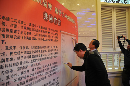 建安商會(huì)常務(wù)副會(huì)長(zhǎng)吳士茂代表商會(huì)理事會(huì)作工作報(bào)告,秘書長(zhǎng)戴壯民介紹了華建聯(lián)盟成立一年來(lái)的運(yùn)行情況,主席臺(tái)上的各位領(lǐng)導(dǎo)為10個(gè)新進(jìn)會(huì)員代表頒發(fā)證書。副會(huì)長(zhǎng)曹德榮宣讀了市建安商會(huì)《打造“揚(yáng)州建筑”品牌,服務(wù)世界名城建設(shè)共同宣言》,然后所有會(huì)長(zhǎng)單位負(fù)責(zé)人一起上臺(tái)簽署《共同宣言》,表達(dá)了共同打造揚(yáng)州建筑品牌、抱團(tuán)包容發(fā)展、擔(dān)當(dāng)建設(shè)秀美揚(yáng)州生力軍的共同愿望。