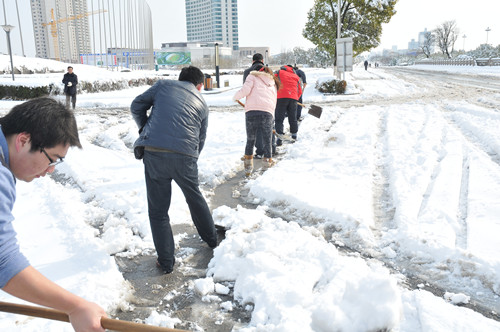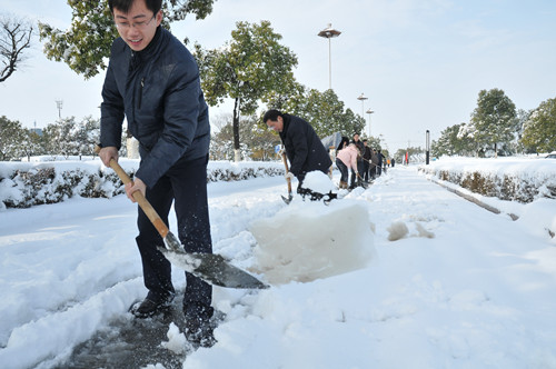 公司總部組織員工上路清掃積雪 時(shí)間:2013-02-19 4497 2月18日至19日凌晨,揚(yáng)州出現(xiàn)低溫降雪災(zāi)害天氣,降下了多年罕見的一場(chǎng)大雪,壓垮樹枝和部分房屋設(shè)施,并造成道路交通不便。19日清晨,公司響應(yīng)市政府號(hào)召,組織20余名員工上路清掃積雪,公司領(lǐng)導(dǎo)吳士茂、錢啟明親自參加,與大家共同會(huì)戰(zhàn)2個(gè)多小時(shí),完成了清掃任務(wù)。 厚重的積雪壓垮樹枝