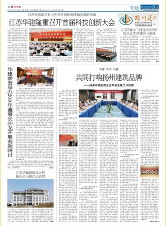 10月28日《揚州日報》B3整版刊發“揚州建工”專版,主要包括江蘇華建首屆科技創新大會、華建聯盟2014年董事長沙龍、江蘇華建與廣安職業技術學院校企合作共建實習基地、華建設計院新辦公大樓啟用和介紹揚州市建安商會5年發展歷程等相關內容,詳情請關注今日《揚州日報》或網站http://www.yznews.com.cn/yzrb/html/2014-10/28/node_124.htm。