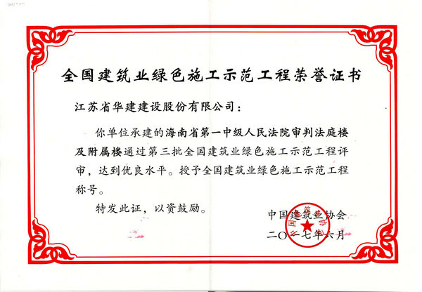 6月28-29日,中國建筑業(yè)協(xié)會綠色建造與施工分會在山東省濟(jì)南市舉辦全國建筑業(yè)綠色施工創(chuàng)新發(fā)展經(jīng)驗交流會,對經(jīng)竣工評審合格的工程頒發(fā)全國建筑業(yè)綠色施工示范工程證書。由海南公司承建的“海南省第一中級人民法院審判法庭樓及附屬樓”項目首次榮獲第三批“全國建筑業(yè)綠色施工示范工程”稱號。