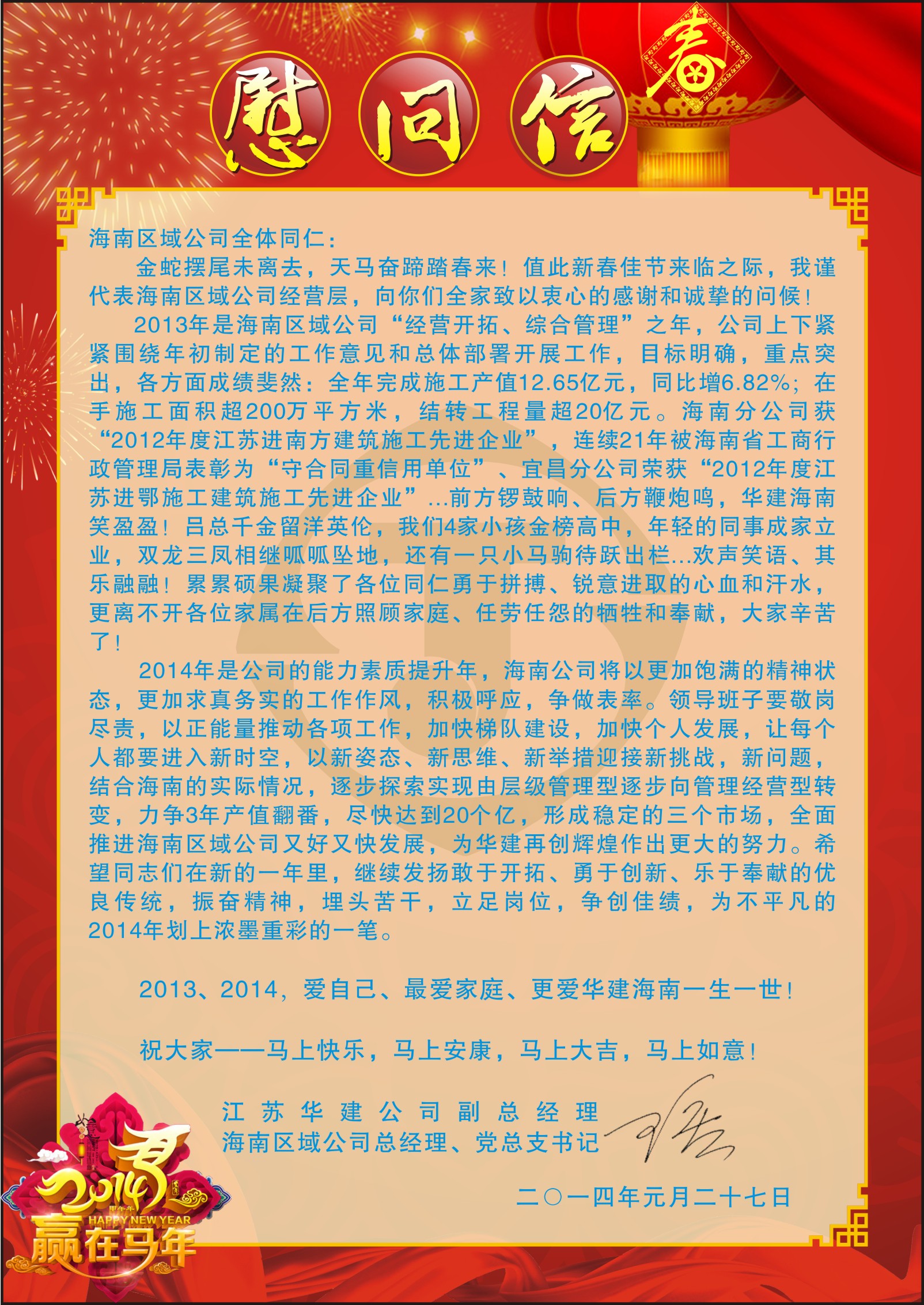 公司副總、海南區(qū)域公司總經(jīng)理王宏致全體員工新春慰問信