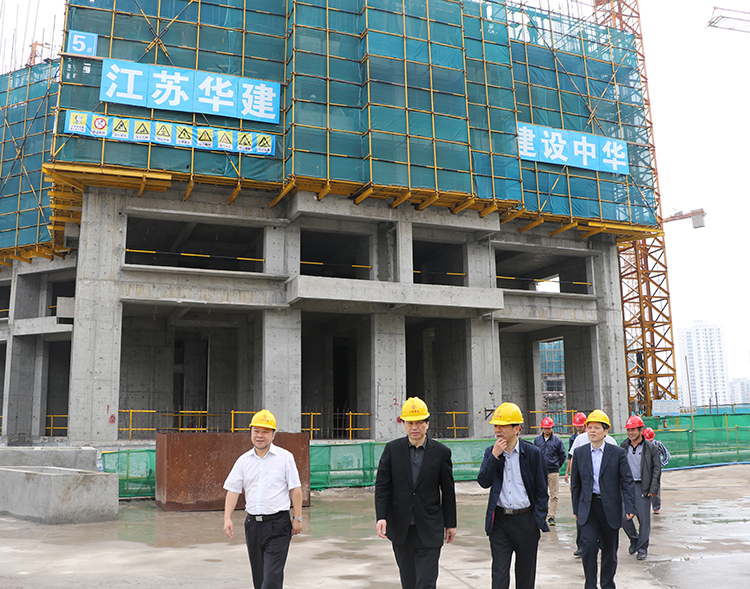 在公司承建的恒大外灘中心施工現(xiàn)場,朱市長與項目管理人員一一握手,向大家表示親切問候。在陪同人員引導下,他饒有興致地邊走邊看,聽取項目負責人對工程特點、工程進展、工程用材等方面的情況匯報,不時點頭稱贊施工人員的工藝水平和施工技藝,并與項目部主要管理班子親切合影。
