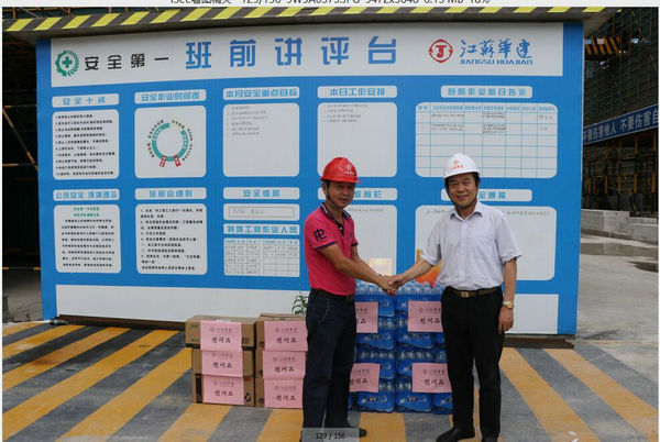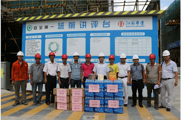 區(qū)域公司領(lǐng)導赴三亞工地進行高溫慰問 時間:2015-06-20 3463 6月19日上午,海南分公司黨總支副書記沈巨青帶隊,在分公司工會代表等相關(guān)部門陪同下,走訪慰問了三亞婦幼保健院項目部,看望了堅守崗位奮戰(zhàn)在高溫一線的項目部人員,并給他們送去了礦泉水、洗漱用品和防暑藥品。 慰問組一行實地了解項目部的進展情況以及現(xiàn)場人員的食、住、行、業(yè)務學習安排等情況,叮囑大家在高溫季節(jié)要切實加強現(xiàn)場管理,繃緊安全弦,確保平穩(wěn)有序生產(chǎn)。