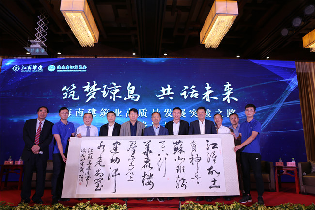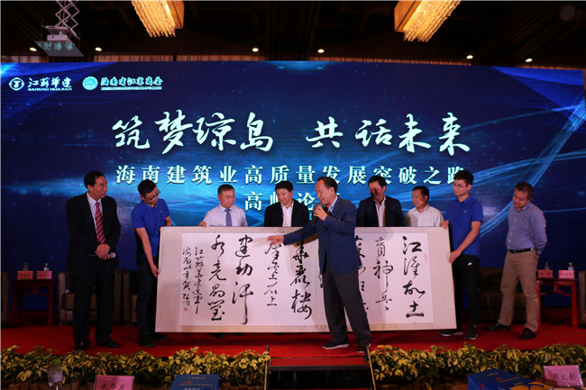 論壇上,原海南省委常委、宣傳部長(zhǎng)、國(guó)家行政學(xué)院原副院長(zhǎng)周文彰欣然為江蘇華建進(jìn)瓊?cè)苣曩x詩(shī)題字:“江淮沃土育神兵,蘇北班輸天下行。華麗樓群基石上,建功汗水亮晶瑩”。