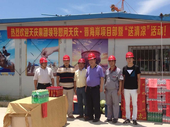 千里送清涼——天慶集團(tuán)董事長韓慶慰問我司一線職工 時間:2015-08-05 4412 8月4日中午,烈日當(dāng)空,驕陽似火。甘肅天慶房地產(chǎn)集團(tuán)有限公司董事長韓慶一行不遠(yuǎn)千里來到廣東珠海,頂著烈日,冒著酷暑,在項(xiàng)目負(fù)責(zé)人陳建的陪同下,慰問我司承建的“天慶·晉海岸”項(xiàng)目一線施工人員,給工人們送來了西瓜、礦泉水、王老吉等飲品和深情問候,讓廣大一線職工在炎炎烈日下感受到陣陣清涼。