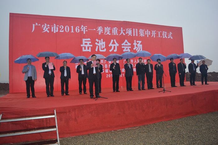 3月21日上午,廣安市2016年一季度重大項(xiàng)目集中開工儀式岳池分會(huì)場在岳池城東新區(qū)隆重舉行,以公司岳池城東新區(qū)基礎(chǔ)設(shè)施、智慧城市及海綿城市建設(shè)PPP項(xiàng)目為代表的一批項(xiàng)目正式開工建設(shè)。廣安市委常委、組織部長黃秀川、副市長席世洪,岳池縣委副書記、縣長湯才勇等領(lǐng)導(dǎo),廣安市住建、交通、水務(wù)等部局負(fù)責(zé)人,岳池縣人大、政協(xié)及縣住建、發(fā)改等多個(gè)部局負(fù)責(zé)人出席活動(dòng)。岳池縣委常委、常務(wù)副縣長鐘愛平主持儀式。