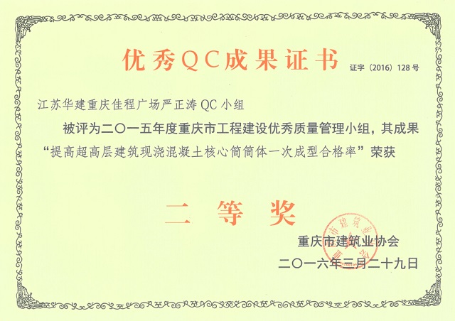 公司新增2項(xiàng)省級QC成果 時(shí)間:2016-04-06 4563 近日,重慶市建筑業(yè)協(xié)會(huì)發(fā)文表彰了一批優(yōu)秀QC成果,公司重慶佳程廣場項(xiàng)目嚴(yán)正濤、沈正祥QC小組被評為2015年度重慶市工程建設(shè)優(yōu)秀質(zhì)量管理小組,其成果“提高超高層建筑現(xiàn)澆混凝土核心筒筒體一次成型合格率”、“提高鋼筋機(jī)械套筒連接合格率”等均榮獲二等獎(jiǎng)。