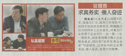 元月7日的《揚(yáng)州日報(bào)》焦點(diǎn)新聞欄目報(bào)道了我公司董事長陸金龍參加揚(yáng)州市七屆人大二次會(huì)議的有關(guān)...