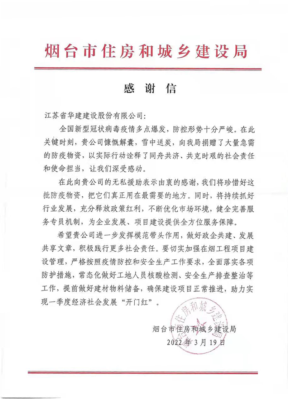3月19日,公司收到煙臺市住建局發(fā)來的感謝信,信中對公司大力支持疫情防控,捐贈防控物資表示...