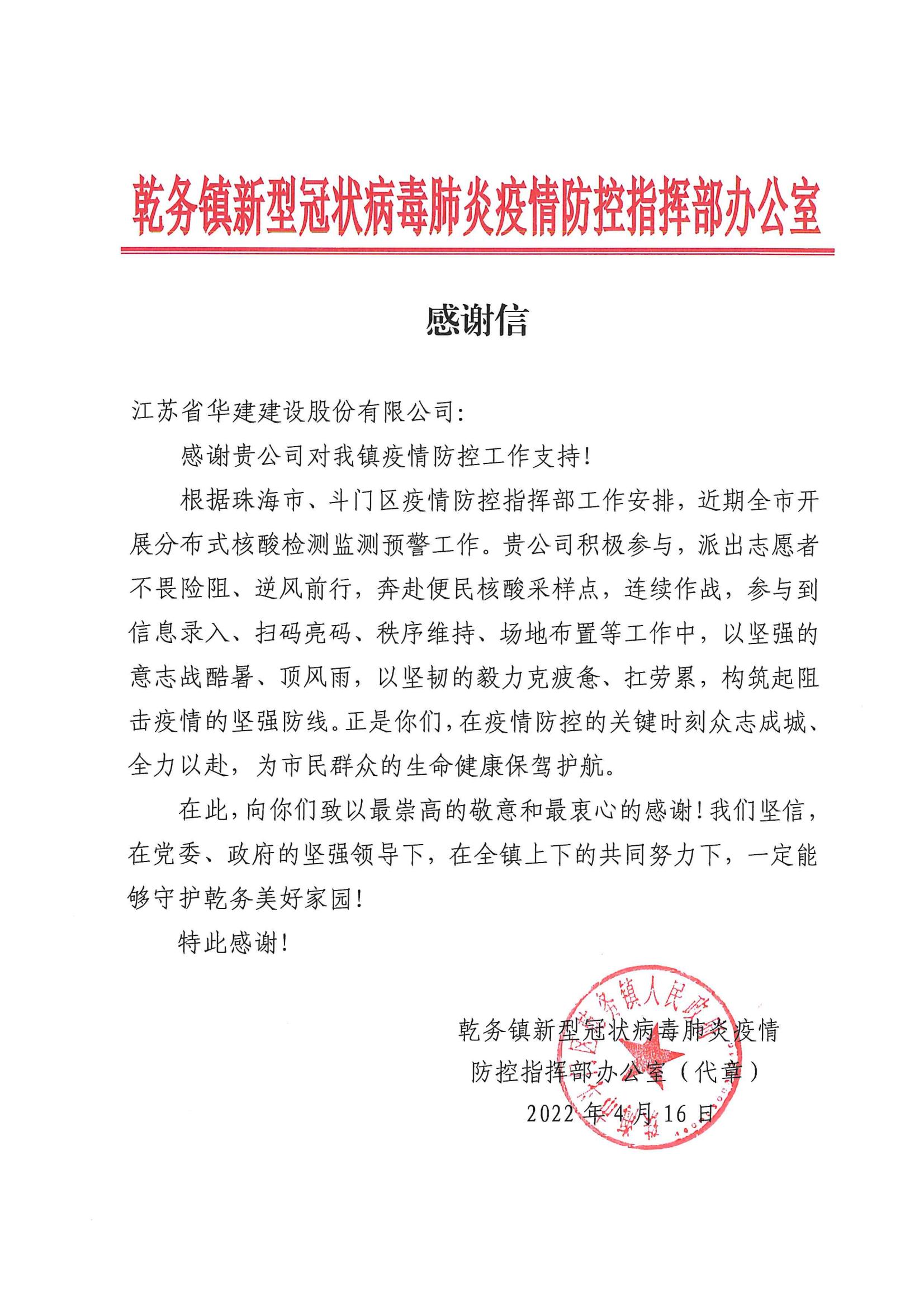 近日,公司收到斗門區(qū)乾務鎮(zhèn)新型冠狀病毒肺炎疫情防控指揮部辦公室感謝信,對公司第五直管項目部...