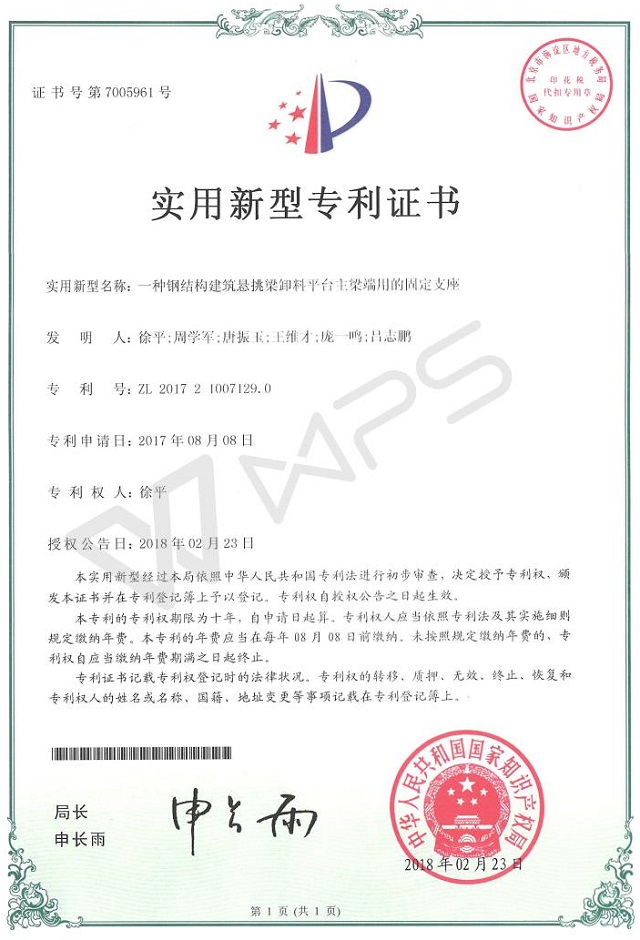 近日,從國家知識產(chǎn)權局傳來喜訊,公司申請的《一種鋼結(jié)構建筑懸挑梁卸料平臺主梁端用的固定支座...