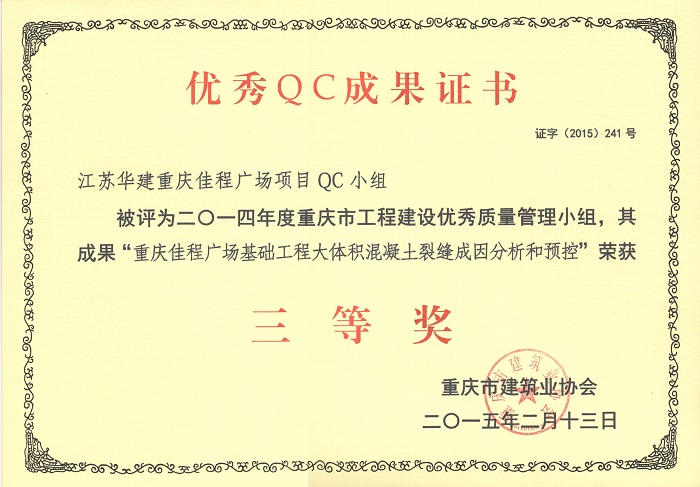 近日,重慶市建筑業(yè)協(xié)會(huì)發(fā)文表彰了一批優(yōu)秀QC成果,公司重慶佳程廣場項(xiàng)目QC小組被評為201...