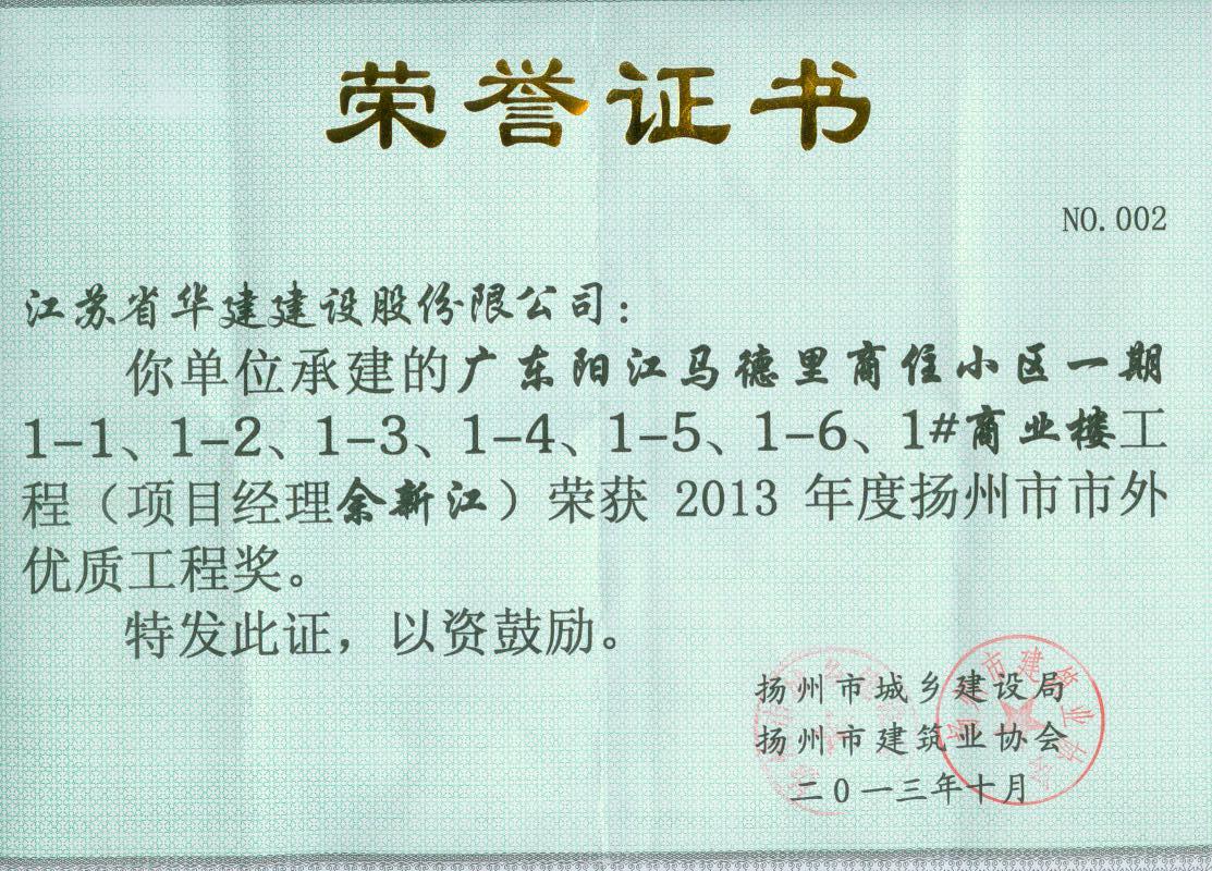 2013年陽江陽光馬德里項(xiàng)目揚(yáng)州市市外優(yōu)質(zhì)工程獎(jiǎng)