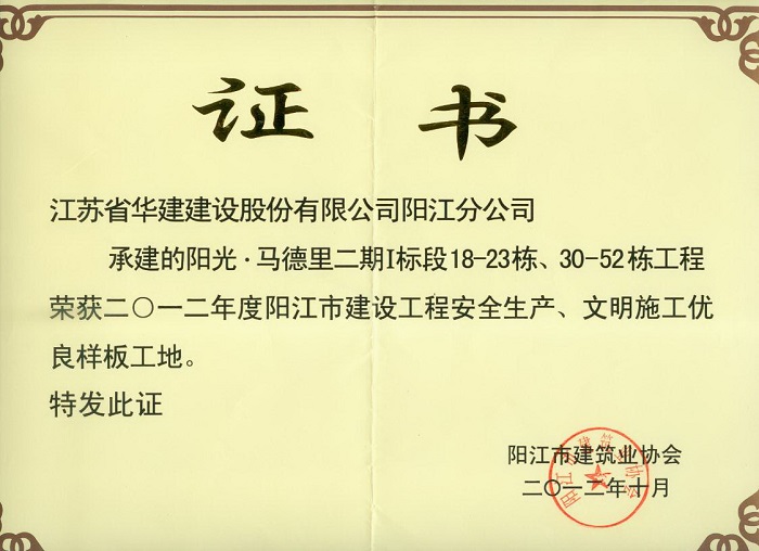 2012年陽光馬德里二期陽江市建設(shè)工程安全生產(chǎn)、文明施工優(yōu)良...