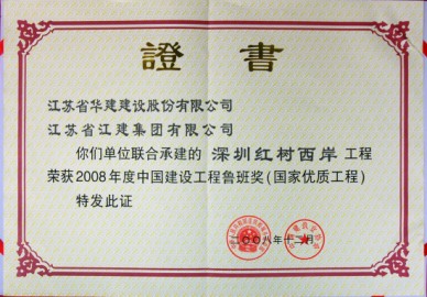 紅樹(shù)西岸工程位于深圳填海區(qū),由3棟31層的折線形塔樓組成,建筑高度99.2米,建筑面積33.4萬(wàn)平方米,3幢高層住宅樓呈“風(fēng)車”狀組合在大面積水景花園之中,既富現(xiàn)代氣息、又與自然環(huán)境和諧共生,是深圳灣畔極具標(biāo)志性的高尚住宅建筑。工程2003年10月20日開(kāi)工, 2006年3月28日竣工,獲得2007年度深圳市優(yōu)質(zhì)工程、“金牛獎(jiǎng)”;2007年度江蘇省省外優(yōu)質(zhì)工程“揚(yáng)子杯”;2007年度廣東省優(yōu)良樣板工程、“金匠獎(jiǎng)”;2005年度深圳市優(yōu)質(zhì)結(jié)構(gòu)工程獎(jiǎng);2005年度深圳市新技術(shù)應(yīng)用示范工程第一名;2005年度江蘇省新技術(shù)應(yīng)用示范工程;2006年11月通過(guò)建設(shè)部第五批全國(guó)建筑業(yè)新技術(shù)應(yīng)用示范工程驗(yàn)收,“整體應(yīng)用水平達(dá)到國(guó)內(nèi)領(lǐng)先”;“控制隔音樓地面施工質(zhì)量”QC成果于2006年4月在江蘇省發(fā)布并榮獲成果一等獎(jiǎng),該項(xiàng)QC成果于2006年7月參加中建協(xié)組織的全國(guó)工程建設(shè)優(yōu)秀QC成果交流,小組榮獲2006年全國(guó)工程建設(shè)優(yōu)秀質(zhì)量管理小組稱號(hào);2008年11月榮獲魯班獎(jiǎng)。