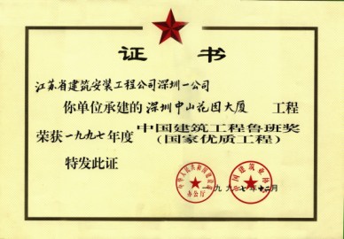 設(shè)備安裝工程,嚴(yán)格執(zhí)行了三檢制度,層層把關(guān),電氣、給排水系統(tǒng)經(jīng)測(cè)試,均滿足設(shè)計(jì)要求。工程于1996年10月被評(píng)為深圳優(yōu)質(zhì)樣板工程第一名,1996年11月獲江蘇省優(yōu)質(zhì)工程金牌獎(jiǎng),繼后榮獲1997年度建筑工程魯班獎(jiǎng)。