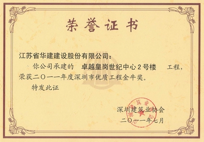 該工程先后被評為深圳市優(yōu)質(zhì)結(jié)構(gòu)工程、深圳市優(yōu)、“金牛獎(jiǎng)”、 廣東省建筑業(yè)新技術(shù)應(yīng)用示范工程、全國AAA級(jí)安全文明標(biāo)準(zhǔn)化誠信工地、江蘇省省優(yōu)“揚(yáng)子杯”和廣東省優(yōu)良樣板工程。2012年,被中建協(xié)評選為2012-2013年度中國建設(shè)工程魯班獎(jiǎng)(國家優(yōu)質(zhì)工程)。