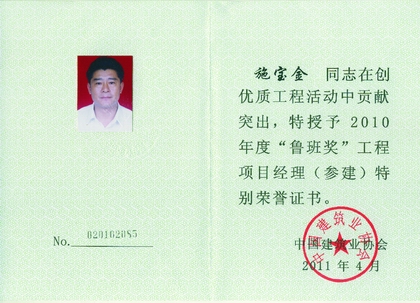 施寶金 時間:2012-04-10 8206 施寶金,高級工程師,現(xiàn)任深圳公司七處二工區(qū)常務副主任、項目經(jīng)理。1996年到深圳參加工作,參與過國際商會中心、榮超經(jīng)貿(mào)中心、江勝大廈、綠景紀元大廈等重點項目施工,獲“深圳市建筑業(yè)企業(yè)優(yōu)秀項目經(jīng)理”稱號,被授予“創(chuàng)魯班獎工程項目經(jīng)理特別榮譽證書”。