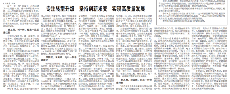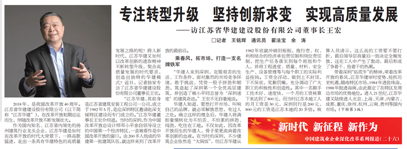 王宏董事長接受《建筑時報》專訪:專注轉型升級,堅持創新求變,實現高質量發展 時間:2018-09-11 4431 9月10日,《建筑時報》頭版及微信公眾號對王宏董事長的專訪給予了刊載。 王宏董事長在專訪中就江蘇華建成立36年來,是如何在改革開放的時代大背景下,走出一條具有華建特色的高質量發展之路,跨入新時代,江蘇華建又是如何以改革創新的進取精神不斷轉型升級,契合高質量發展的時代要求,創造出獨特的華建模式進行了詳細介紹。