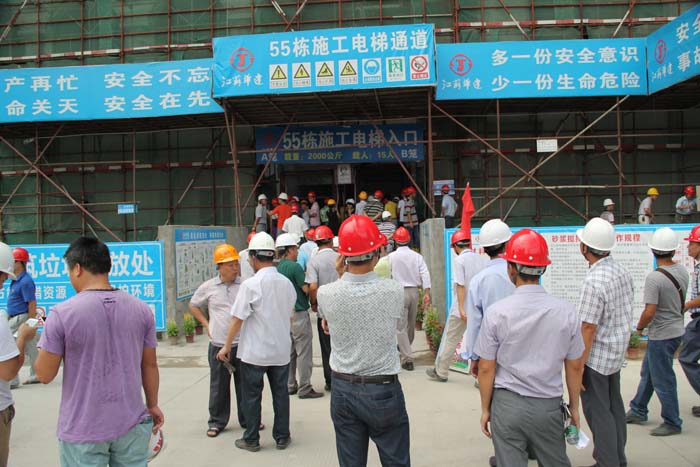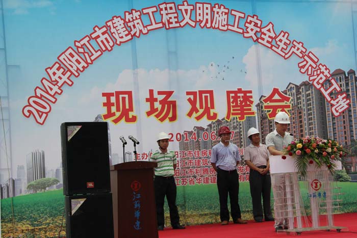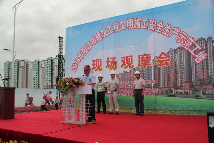 6月17日上午,“2014年陽(yáng)江市建筑工程文明施工安全生產(chǎn)示范工地現(xiàn)場(chǎng)觀摩會(huì)”,在我公司第一項(xiàng)目部施工的陽(yáng)光馬德里二期工程項(xiàng)目現(xiàn)場(chǎng)舉行。陽(yáng)江市建設(shè)局副局長(zhǎng)馮成富、質(zhì)量安全監(jiān)督站站長(zhǎng)林子歡、書(shū)記何聲海和各縣(市、區(qū))住建局安全生產(chǎn)分管負(fù)責(zé)人、安監(jiān)站站長(zhǎng)以及所有施工、監(jiān)理單位負(fù)責(zé)人、安全管理人員近300人參加觀摩會(huì)。
