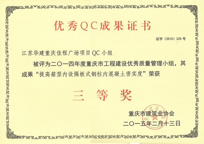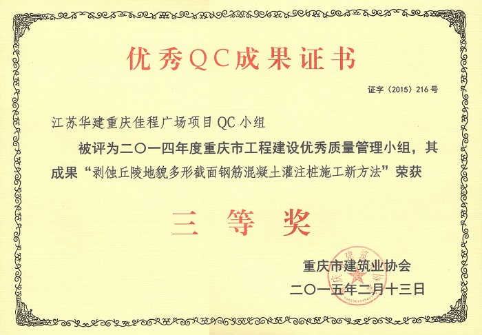 公司3項QC成果榮獲重慶市三等獎 時間:2015-04-02 5110 近日,重慶市建筑業(yè)協(xié)會發(fā)文表彰了一批優(yōu)秀QC成果,公司重慶佳程廣場項目QC小組被評為2014年度重慶市工程建設優(yōu)秀質量管理小組,其成果“提高箱型內設隔板式鋼柱內混凝土密實度”、“剝蝕丘陵地貌多形截面鋼筋混凝土灌注樁施工新方法”、“重慶佳程廣場基礎工程大體積混凝土裂縫成因分析和預控”等均榮獲三等獎。