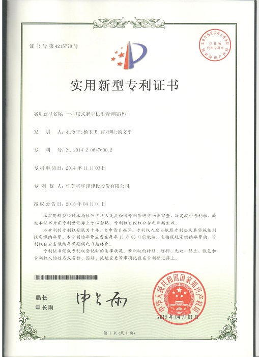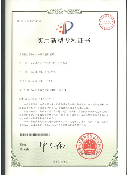 三項實用新型成果分別是:1、《一種預(yù)留洞用模具》(專利號:ZL201420647560.1,專利權(quán)人:孔令正、嚴(yán)正濤、楊玉飛、郭冬冬);2、《一種型鋼混凝土的模板支撐結(jié)構(gòu)》(專利號:ZL201420647633.7,專利權(quán)人:孔令正、楊玉飛、曹亞明、郭冬冬);3、《一種塔式起重機(jī)附著伸縮撐桿》(專利號:ZL201420647600.2,專利權(quán)人:孔令正、楊玉飛、曹亞明、湯文平)。