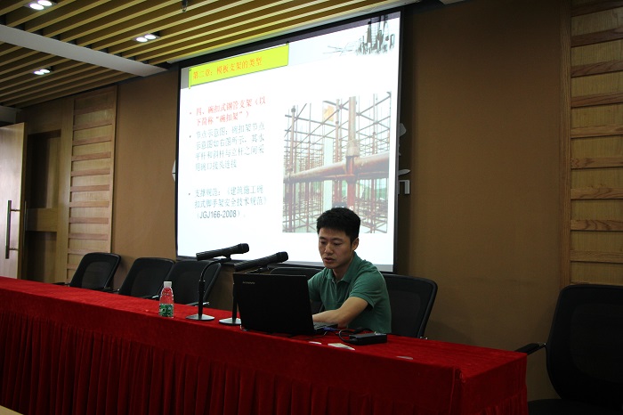 會上,安全設備處主任丁瑞華、副主任陳榮就腳手架和模板支架搭設具體細節(jié)實施、施工現(xiàn)場存在的問題等,以圖文并茂的形式展示了關鍵點與控制要領,使培訓人員對腳手架搭設和模板支架搭設安全控制點更加清晰明朗。盧總分享了北京綠色施工和公司魯班獎項目考察學習的經(jīng)驗感悟,就其中珠海公司可以借鑒學習的部分做了深入細致的講解,他激勵大家要以魯班精神打造華建的精品工程。