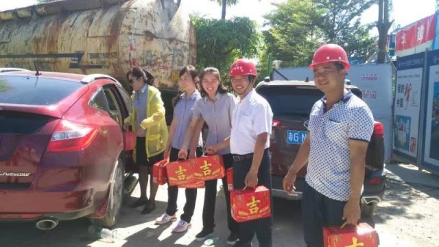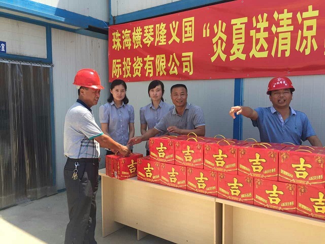 炎炎夏日送清涼 時(shí)間:2016-08-01 4202 7月30日上午,珠海分公司橫琴隆義廣場(chǎng)項(xiàng)目部工地?zé)崂顺欤瑱C(jī)聲隆隆,人來(lái)人往,一派繁忙景象。一支由江蘇華建直五項(xiàng)目部和橫琴隆義投資公司共同組成的“送清涼”小分隊(duì)也在工地上奔忙著,項(xiàng)目經(jīng)理姚寧與投資公司負(fù)責(zé)人王艷、許珂等正在將一箱箱王老吉飲料有條不紊地送到建筑工人手中,讓廣大一線職工在炎炎烈日下感受到陣陣清涼。