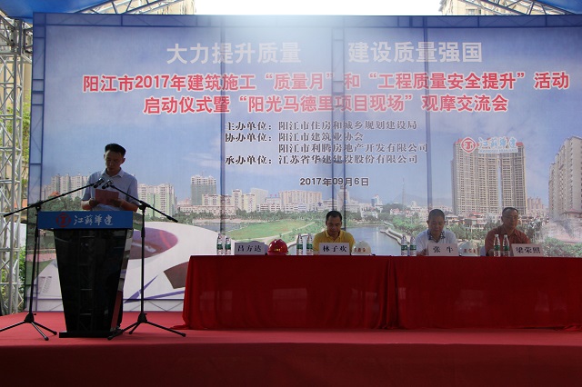 珠海區(qū)域公司總經(jīng)理呂方達出席會議并發(fā)言。呂總在發(fā)言中指出,江蘇華建自進入陽江市場以來一直秉承“質(zhì)量興企”的基本理念,高度重視質(zhì)量管理工作,在陽江市場樹立了良好的口碑。陽光馬德里二期56-61棟項目在決策前期就先確立高起點的質(zhì)量創(chuàng)優(yōu)目標(biāo),在施工過程中嚴(yán)格執(zhí)行各項流程、制度,通過宣傳、培訓(xùn)、確立獎罰目標(biāo)等方式在項目部內(nèi)部創(chuàng)造了良好的創(chuàng)優(yōu)氛圍。同時加大對新型綠色施工技術(shù)、新材料、新工法的創(chuàng)新投入,主體結(jié)構(gòu)采用鋁模技術(shù)施工,創(chuàng)造了3天一層的陽江建設(shè)新速度。呂總表示,本次活動放在我們施工現(xiàn)場舉行,既是對江蘇華建的信任,更是一種鞭策!今后將一如既往地繼續(xù)重視質(zhì)量管理工作,多創(chuàng)精品工程,不辜負(fù)陽江市住建局和廣大業(yè)主的信任、支持,力爭在質(zhì)量創(chuàng)優(yōu)、技術(shù)創(chuàng)新方面取得更多、更好的成績!